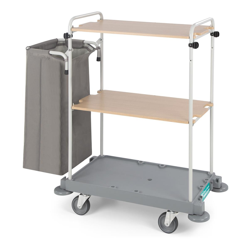 Dieser für 15 bis 18 Zimmer ausgelegte Systemwagen überzeugt durch seine zwei Holz-Ablagen, dem selbsttragenden 90l Sack und dem großen Grundgestell inkl. der stabilen 150mm Räder.Ein müheloses Handling besitzt der Green Hotel 871