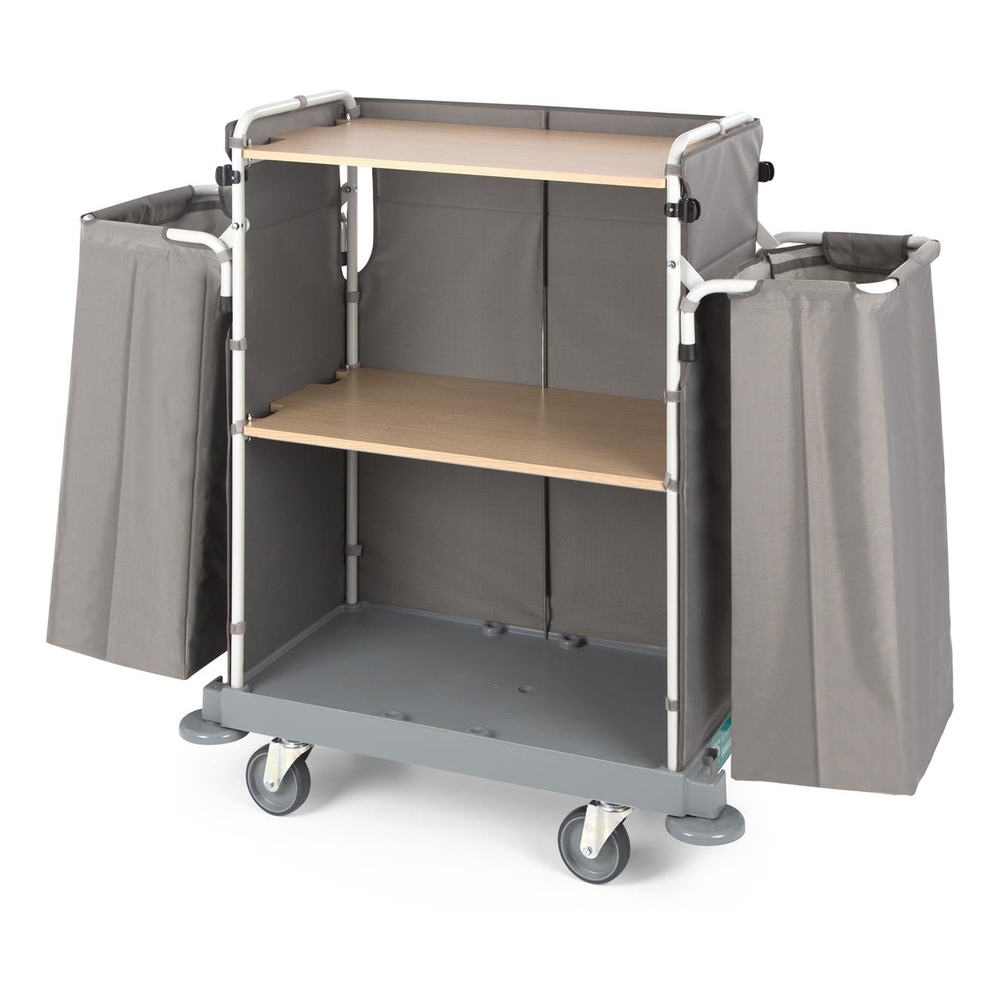 Diesen Systemwagen zeichnen die beiden selbsttragenden 90l Säcke aus, welche jeweils seitlich am Wagen befestigt sind. Daher eignet sich dieser Wagen ideal zur Mülltrennung. Außerdem bieten die zwei MDF-Ablagen ausreichend Platz. Der Wagen wird für den Einsatz in 15 bis 18 Zimmern empfohlen.Dezent gestalteter Green Hotel 875