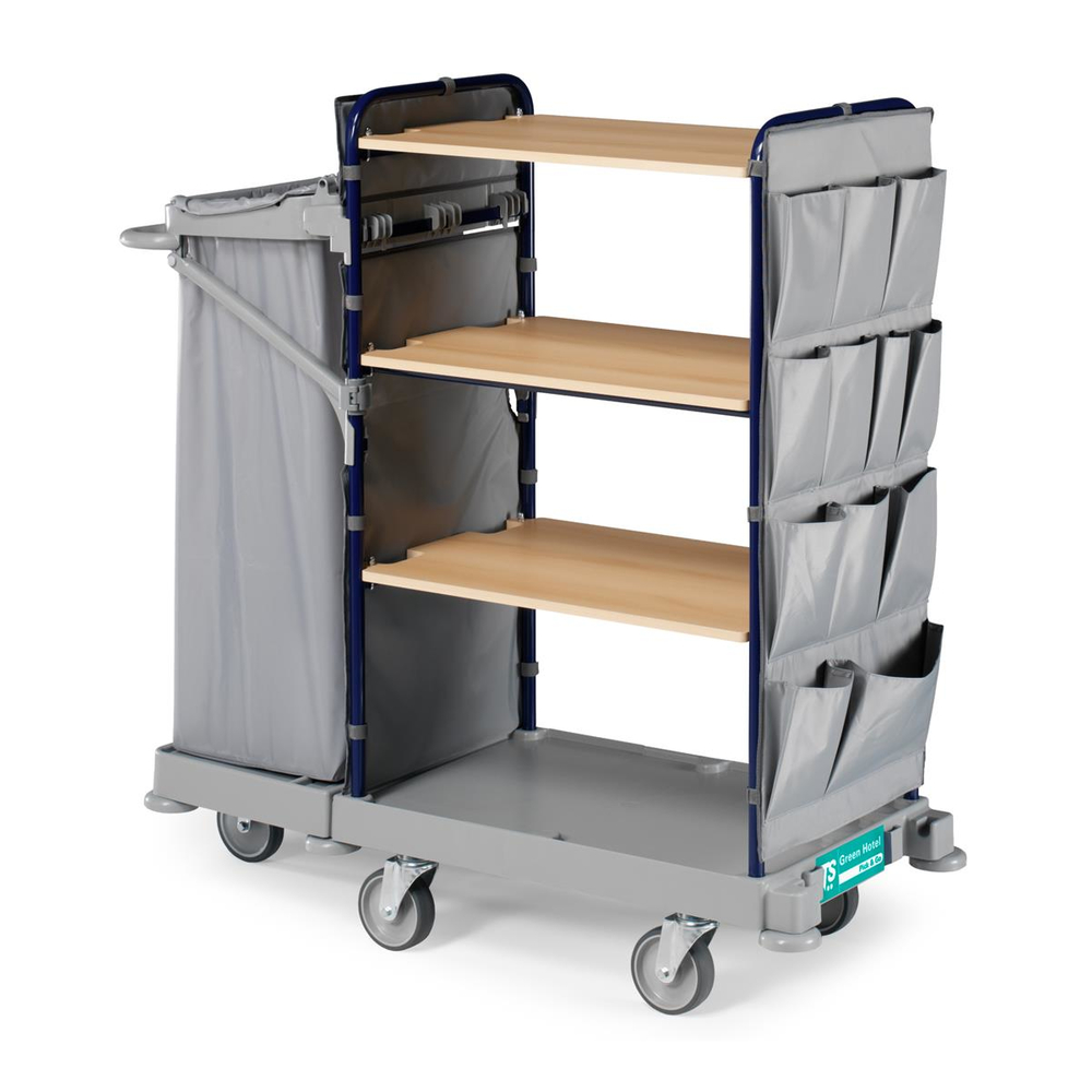 Dieser Systemwagen ist äußerst vielseitig nutzbar. Zum Einen bieten die drei MDF-Ablagen genügend Stauraum, ebenso die vielen Taschen der Seitenwand, und zum Anderen können Sie in dem 120l Sack Müll oder Dreckwäsche verschwinden lassen.Modern designter Green Hotel 904