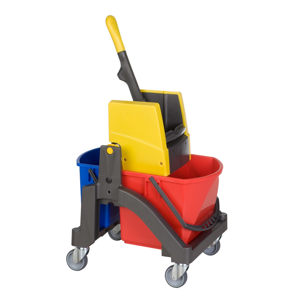 Nasswischwagen aus robustem Kunststoff mit Eimer á 17 l in der Farbe rot und zusätzlich Eimer á 6 l in der Farbe blau mit Vertikalpresse VK 4 in der Farbe gelb, für alle Reinigungsaufgaben im Nasswischbereich, stabile 75 mm Lenkrollen sorgen für leichtes Transportieren und gute Manövrierfähigkeit1x Grundgestell Aquva 1 x 17 l, Rollen 75 mm, anthrazit