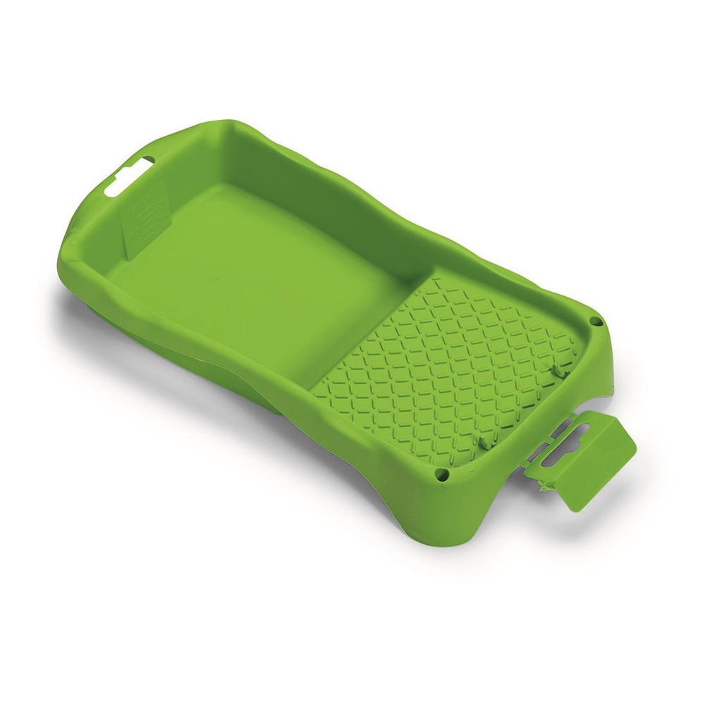 Stabiler, ergonomischer Wannenrand. Großes Füllvolumen, 2 Ausgießer. Aufhängelasche als Pinselstütze verwendbar.Geeignet für Walzenbreite bis 10 cm.