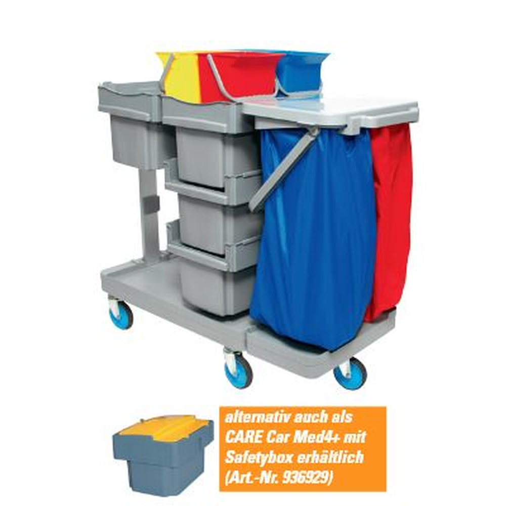 Der stabile CARE Car Med4 Systemwagen ist aus Kunststoff hergestellt und bietet 4 Schubboxen, die Sie entweder für eine hygienische Aufbewahrung oder für das Transportieren von aufbereiteten Wischbezügen nutzen können.
