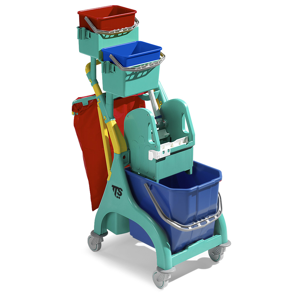 Der Gerätewagen Spani plus 30 ist ein kompakter, platzsparender Systemwagen aus robustem und rostfreiem Kunststoff mit Universal-Presse. Der 25-Liter-Eimer und das Eimergestell sind bei diesem Gerätewagen inklusive. Der Eimer fasst 4 Liter und ist in blau und rot erhältlich. Außerdem hat der Gerätewagen Nürnberg einen 50-L-Sackhalter sowie einen Haken und ein Stilhalter.