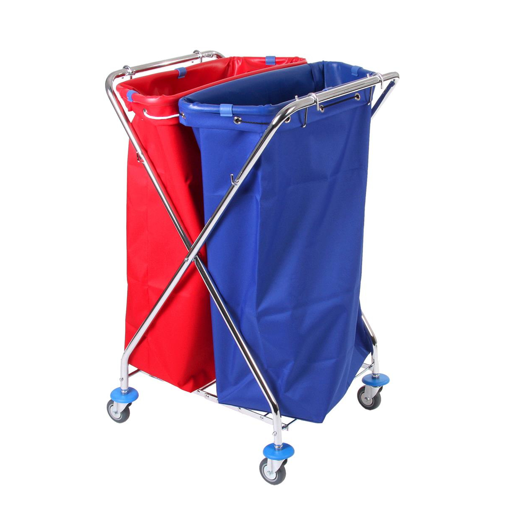 Klassischer, verchromter Entsorgungswagen für Papier, Abfälle oder Laub. Stabiler Halterahmen für 2x120 l Säcke, einhängbar. Durch die praktische X-Form des Grundgestells läßt sich der Wagen zusammenklappen und findet auch in kleineren Abstellräumen Platz. Zusätzlich können 2 Rechteckeimer 14 l für Utensilien ohne Montage seitlich am Wagen angehängt werden. Inklusive 4 Räder 75mm Durchmesser und Anfahrschutz. Die Räder sind 360° drehbar. Die Verchromung ist stoßfest und resistent gegen Reinigungsmittel. Die Entsorgungssäcke sind nicht Bestandteil des Lieferumfangs, können aber optional bestellt werden.
