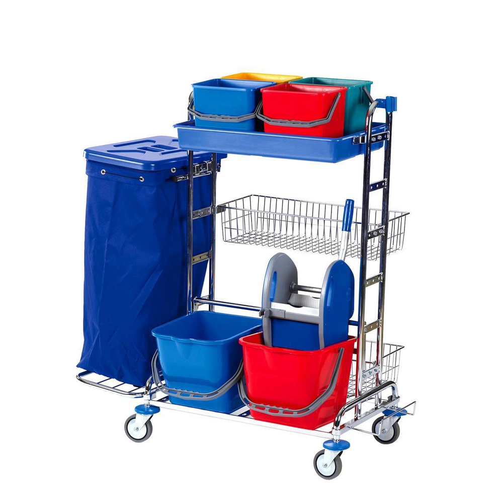 Bewährter, stabiler Wagen mit paralleler Zwei-Eimer-Wischeinheit und einer 120 l Abfalleinheit, 1 Utensilienkorb und eine große Kunststoffwanne mit 4 farbigen 6-l-Eimern für die Trennung der verschiedenen Einsatzbereiche, Ablage für Mopp oder Besen. Der ideale Wagen für größere Flächen, inklusive 4 Räder 100mm Durchmesser und Anfahrschutz. Die Räder sind 360° drehbar. Die Verchromung ist stoßfest und resistent gegen Reinigungsmittel. Deckel und Entsorgungssack sind nicht Bestandteil des Lieferumfangs. Der Deckel kann optional bestellt werden.